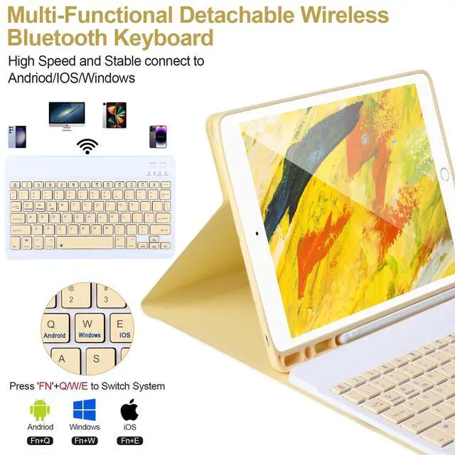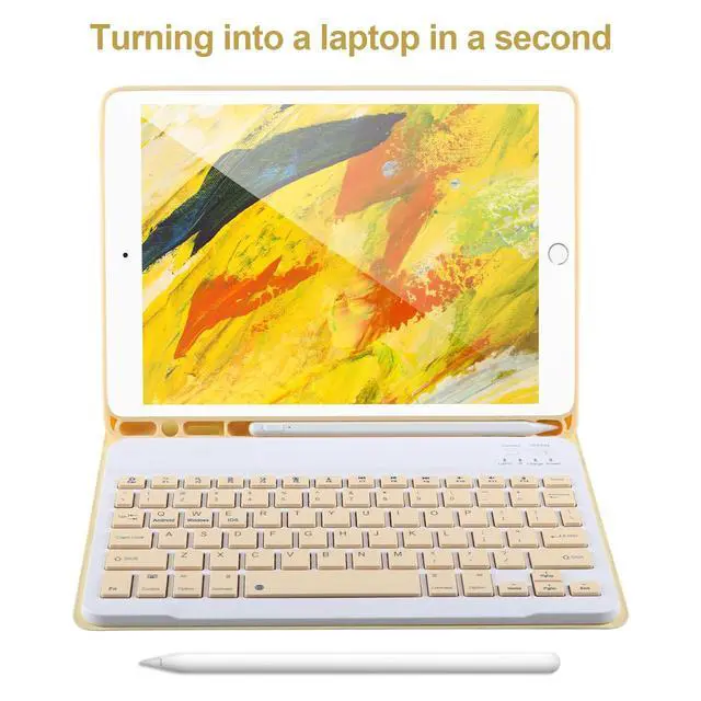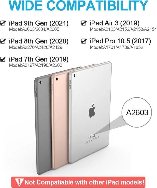 Number: A1701/A1709). Please check your iPad model before purchasing! ^^ Detachable Wireless Bluetooth Keyboard for iPad 10.2 inchAfter this keyboard is connected to your iPad 9/8/7th generation via Bluetooth once, it will automatically connect after subsequent use, turning your iPad into a laptop in seconds! It supports carrying around, which is convenient for entertainment and office. The scissor-style mechanical keyboard feels quiet and smooth, providing you with a comfortable typing experience. ^^ Powerful Battery &Built-in Pencil HolderBuilt-in Strong battery with energy-saving mode, it only takes 2-3 hours to fully charge, work at least 80 hours and stand by for 30+ days. The inner layer of the case is padded with a honeycomb grid, which releases 80% more heat than other iPad cases, preventing overheating to prolong the life of your iPad 9/8/7th Gen, iPad Air 3rd, iPad Pro 10.5 '' Tablet. Built-in Apple Pencil holder, cap and adapter slot, grab your Apple Pencil for easy portability and use. ^^ Multiple angles Stand &Magnetic CaseThis iPad 9th generation case with keyboard adopts clamshell magnet detachment design, can support three different angles of standing, providing