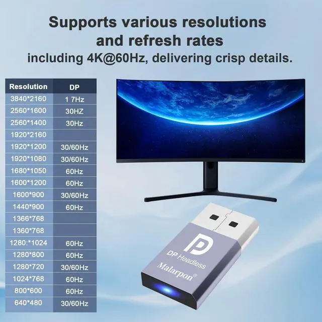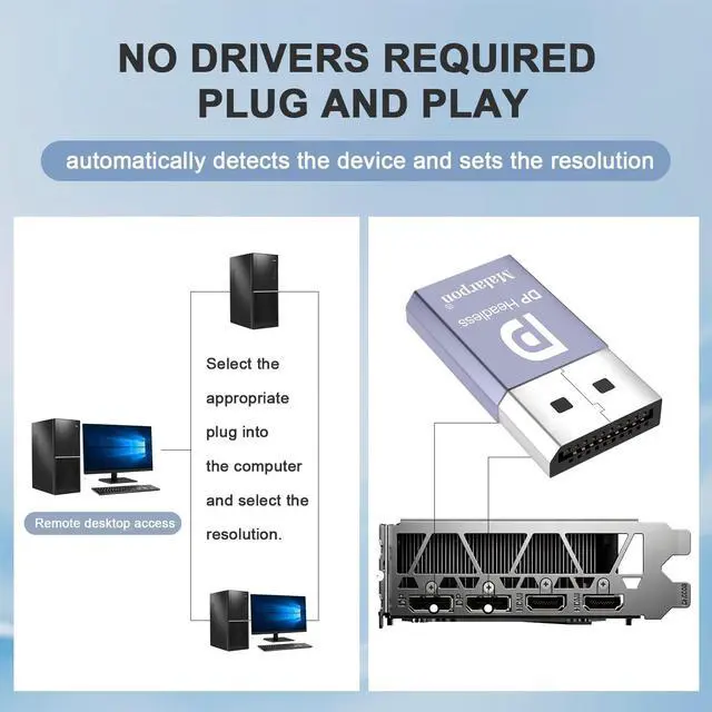 The DP dummg Used for creating a second virtual desktop in VR. Worked well at 1440p Resolution, The screen 'resolution' can be set at many arbitrary configurations up to 7K ^^ Get hardware accelerated Remote Desktop thru moonlight game streaming without needing a monitor Plugged into the machine Work to see 2 monitors through TeamViewer on a headless PC and these worked great ^^ Can remote into a desktop without a monitor for work and it was always reverting to an the old square display ^^ Configuration or power supply just set Design No drivers, no configuration, no power cable - just set and forget Allows for high works with OSX, Windows, Linux and just about anything else ^^ No drivers or config needed download any software or configure the unraid server just plug in adjust Resolution and connect.