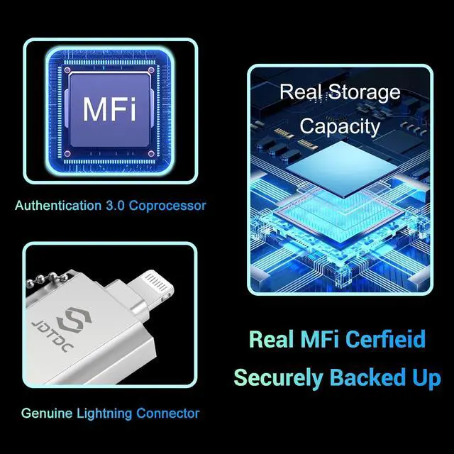 Genuine Apple MFi Certified This Photo Stick is officially licensed by Apple for 100% compatibility, safe, error-free data transfer, and protection for your device. This iPhone USB flash drive features real MFi protection to keep your photos, videos, and files secure and reliableavoid fake MFi clones! ^^ Easy One-Click Backup & Real CapacitySecurely back up photos, videos, contacts from your iPhone & iPad with the JD Memory appjust one click, no complex setup. This iPhone flash drive photo stick offers Real 512GB capacity, get the full, usable external storage no hidden formatting loss.
