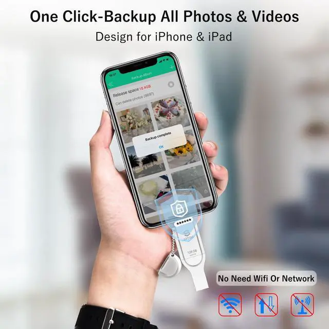 Peace of mind meets high-speed transfer in one reliable, secure device. ^^ Multi-Port Design & Frees Up Phone StorageThis 3-in-1 iPhone USB drive features Lightning, USB-C, and USB 3.0 ports for versatile, high-speed connectivity across iPhone, iPad, Android Mac and PCs. Instantly offload large photos, videos, and files to free up space on your iPhone storage stick or iPad flash drive. Compact, durable, and portable, its perfect for travel, work, or everyday usemaking data transfer fast, easy, and convenient. ^^ Offline Backup & Secure File Transfer No Internet RequiredEffortlessly backup and transfer your photos, videos, and files anytime, anywhere using this iPhone USB Stick without WiFi or internet connection.