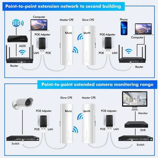 EXTENDED NETWORK WiFi: One Master bridge has to be connected to the master router (that has internet) the second slave bridge has to be connected to the slave WIFI router you want the internet to, extend the network to your neighbor's house, store, barn, or garage through the point-to-point method, saving you money. The network relay function can be realized through 2 pairs of wireless bridges ^^