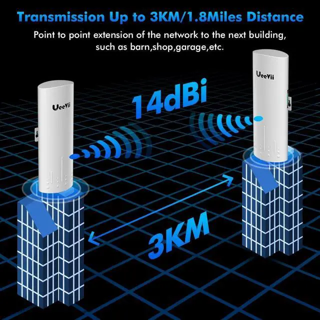 LONG DISTANCE: Automatic power adjustment to adapt to environmental changes, ensuring smooth video regardless of ultra-close distance, transmission distance up to 3km(Barrier-free), actual application distance should be less than 3KM, wireless bridges are installed face-to-face as much as possible, with a clear line of sight and no obstructions ^^