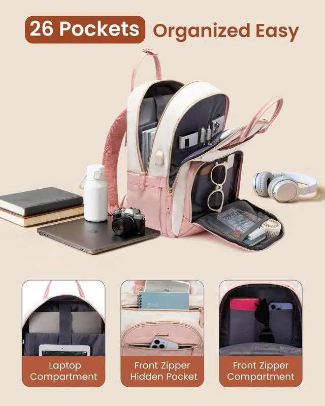 LARGE CAPACITYOne backpack to solve all travel troubles. The large capacity laptop backpack has 6 compartments and more than 26 pockets, which can organize your travel items in an orderly manner, easy for holding laptop, ipads, Phone, binder, water bottle, umbrella, readers, journal, magazine, clothes, wallet and so on.