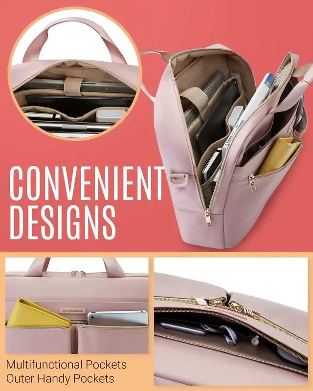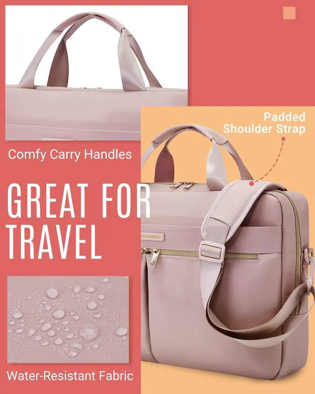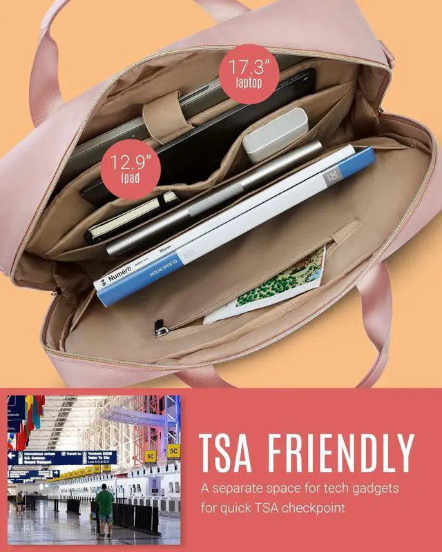 PERFECT CAPACITY & MULTIPLE COMPARTMENTS-Laptop briefcase perfect to throw under seat on an airplane. 3 compartments to meet all your needs well. Laptop case perfect for 17.3 inch laptops, HP/ASUS VivoBook/Notebooks//Macbook air/Acer Chromebook. As well as 12.9 inch iPad, A4 files. Two front pockets allow you to put your daily necessities conveniently. And one large storage compartment can storage your pens, books, passport in an organized manner. Dimension 18"L x 7.8"W x 11.8"H; weight: 1.72 lbs. ^^ TSA FRIENDLY- Convenient at checkpoint. A separate tech compartment with large opening design can make you quickly pass at airport security, and three pockets in main compartment also keep your tech gadgets tidy. ^^ COMFY & ORAGANIZER POCKETS- Adjustable and "C" curve padded ergonomic shoulder strap relieves stress of shoulder; padded vegan leather handles offer light-weight carrying; luggage strap allows briefcase to slide over the luggage tube; and lost of organized pockets aim to ensure a easy business trip or daily commuting. ^^ LAPTOP PROTECTION- The dedicated laptop compartment is fully padded. Laptop case can offer the optimal protection for your 17 inch laptop. You don't need to worry about your notebook getting crashed on the travelling. ^^ LONG LASTING- Made of durable water resistant nylon fabric, with metal zippers to provide a sturdy and reliant using experience. It's perfect for professional office work, business travel or weekend getaway. Its quilted look can serve as a shoulder bag, office bag, laptop carrying bag, laptop crossbody bag, business bag for women.