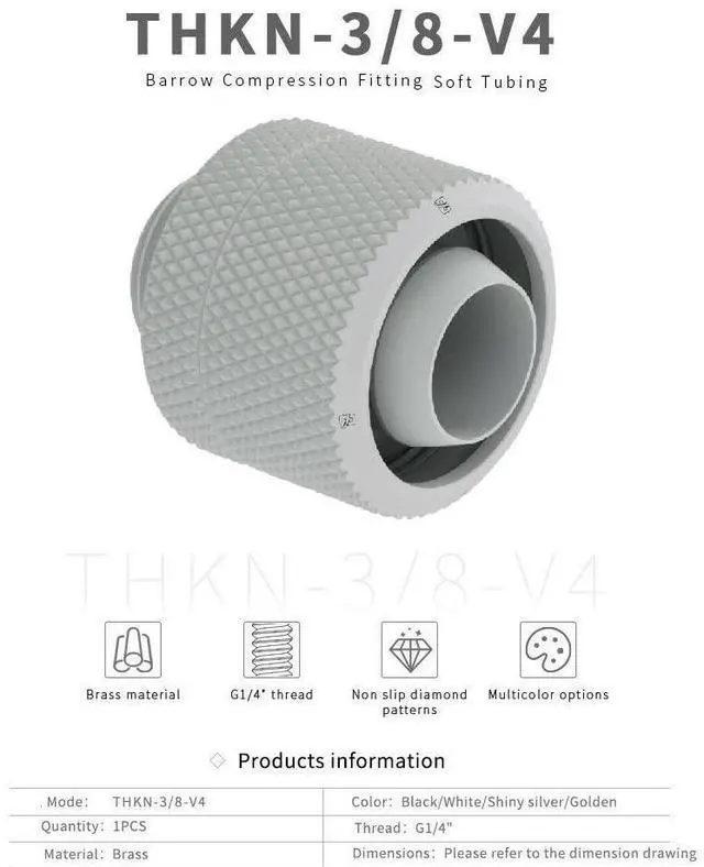 The Barrow Compression Fitting is designed for 3/8" Inner diameter 5/8" outer diameter tubing. The product matching series are designed to look elegant in every system, highlighting the individual design of the computer. With a new process during chromatizing, the surface finish is completely connected with the brass body, hence ensuring permanent intense colors and peeling of the chrome layer.