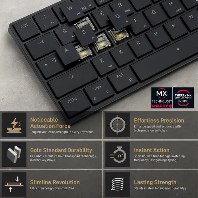 Cherry MX ULP switch in DetailHigh-precision mechanical CHERRY MX switch engineered for ultra-low profile desktop applications. ^^ Super Slim KeycapLaser carving ABS keycaps, feels extremely stable while typing. ^^ Detachable USB-C CableThe USB-C cable brings you a more stable connection. ^^ Macro Function ModeThe entire keyboard is programmable to assign a macro and remapping to most keys and create key bindings so you can customize the keyboard based on your needs, whether you are a gamer, typist, or programmer. ^^ Compatible with Windows/ MacOSEasily switches between MacOS and Windows for different systems via the DIP switch on the keyboard bottom.