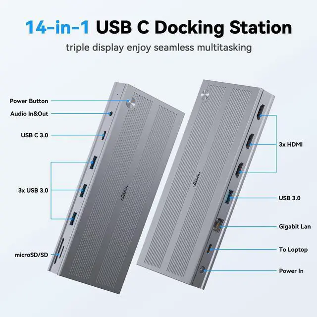 Powerful Scalability: This USB C docking station triple monitor has 14 ports, capable of expanding to 3 monitors, providing a all in one solution for all your connectivity requirements. Designed for users seeking a reliable multi-monitor solution. The included 120W independent power adapter ensures your laptop receive consistent, high-speed charging. Perfect for home offices and demanding corporate environments ^^ Triple