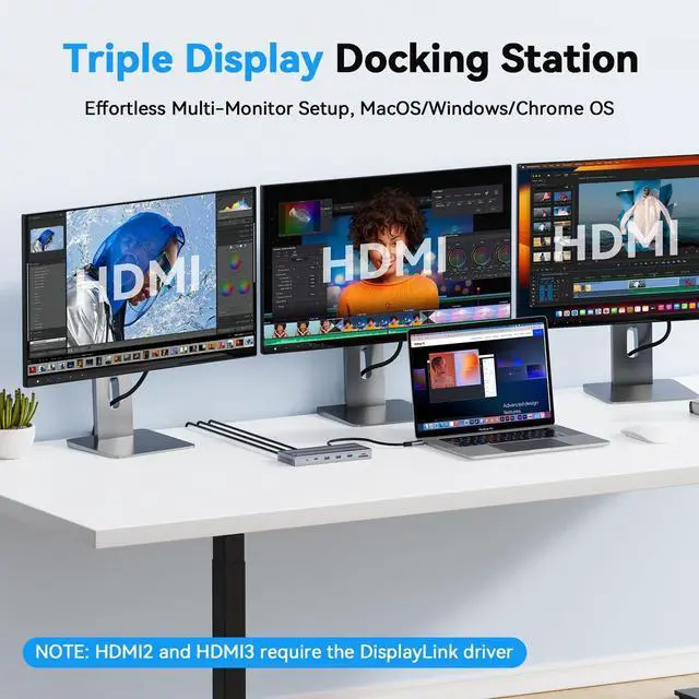 Widely Compatibility: The laptop docking station 3 monitors offers higher compatibility. It is compatible with USB4, full-featured USB-C laptops, Thunderbolt and full-featured USB-C laptops, and works with Windows 10 and above, macOS 11 and above, Chrome OS 100 and above. Requires installation of DisplayLink Drivers before using the laptop docking station.