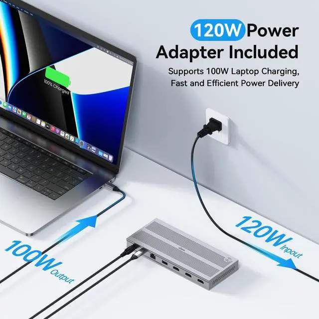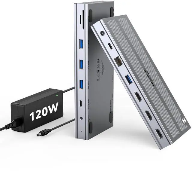 Power Supply: Equipped with a 120W power supply, no more low-battery anxiety! The displaylink docking station 3 monitors ensures your devices stay powered up, so you can work or play for longer without interruptions, experience rock-solid connection stability for external hard drives and monitors, even under full load ^^