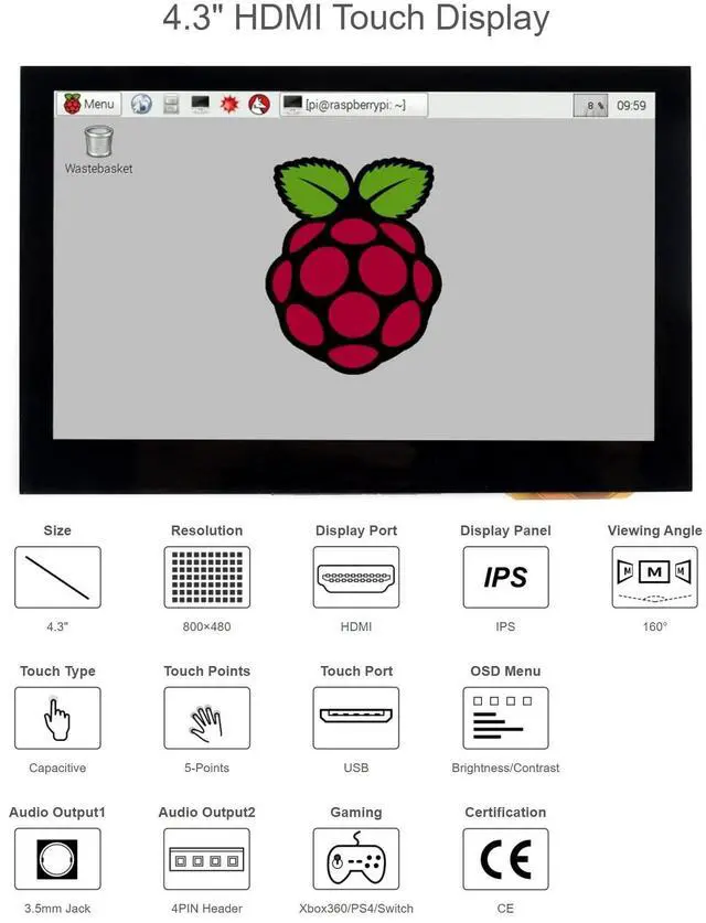 Device & System SupportRaspberry PiSupports Raspbian, 5-points touch, driver freeSupports Ubuntu / Kali / WIN10 IoT, single point touch, driver freeSupports Retropie, driver freeSupports all versions of Raspberry PiJetson NanoSupports Ubuntu, single point touch, driver freePCSupports Windows 11 / 10 / 8.1 / 8 / 7, 5-points touch, driver freeGame ConsoleXbox360, PS4, Switch... Package include1. 4.3 inch HDMI LCD (B) x 1 2. HDMI cable x1 3. USB-A to Micro-B cable x1 4. HDMI Adapter (B) x1 5. USB Adapter (B) x1 6.