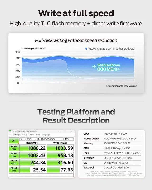 Stable 1090MB/s Speed, No DropMOVE SPEED Vpro Series portable ssd writes at 1090MB/s full speed across the entire 2TB external SSD with no slowdowns, even during large transfers. Additionally, the upgraded SSD-class 2tb external ssd features significantly enhanced heat dissipation, ensuring optimal performance and a better overall user experience while maintaining high-speed data transfer. ^^ Dual Interfaces and Data BackupMOVE SPEED Vpro series USB C flash drive have USB 3.2 Gen 2 & Type-C dual interfaces. USB 3.2 Gen2 port is for computer, laptop, and usb c port is for Android phone and phone with USB C port.