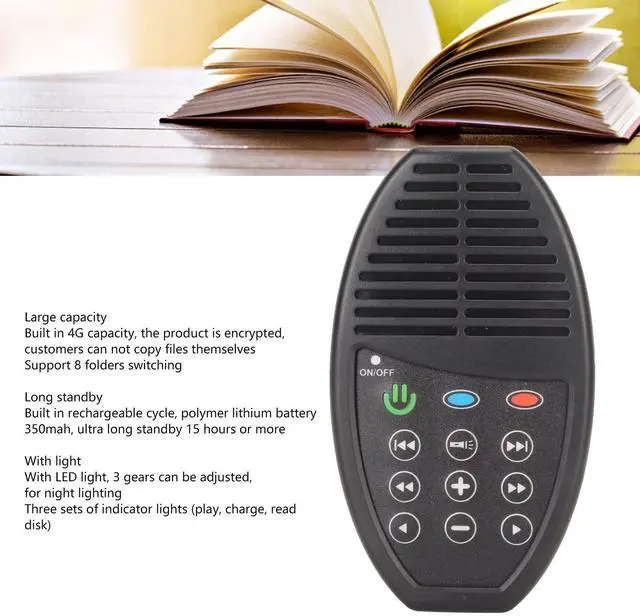 ADJUSTABLE DESIGN: File selection (previous song, next song ) (previous chapter, next chapter) (fast forward, fast rewind) (pause, play) Loud sound adjustable.