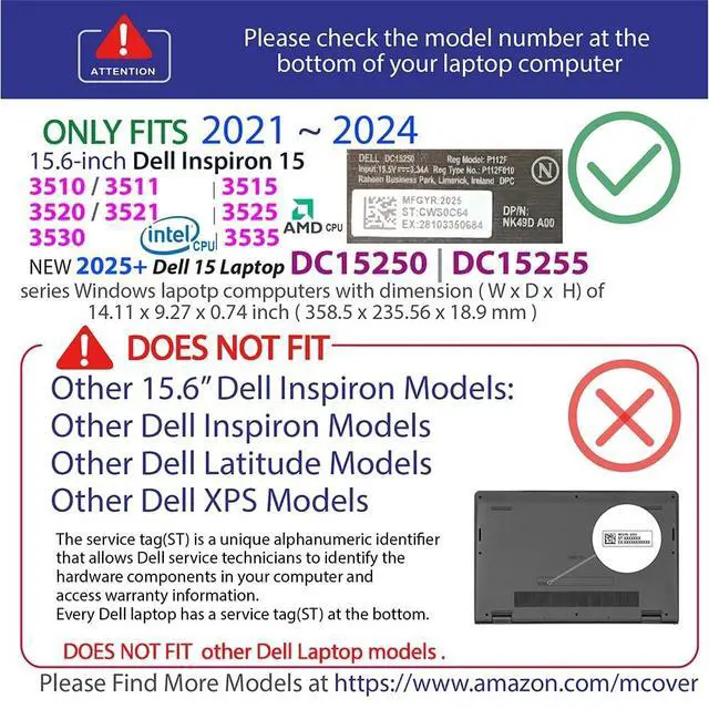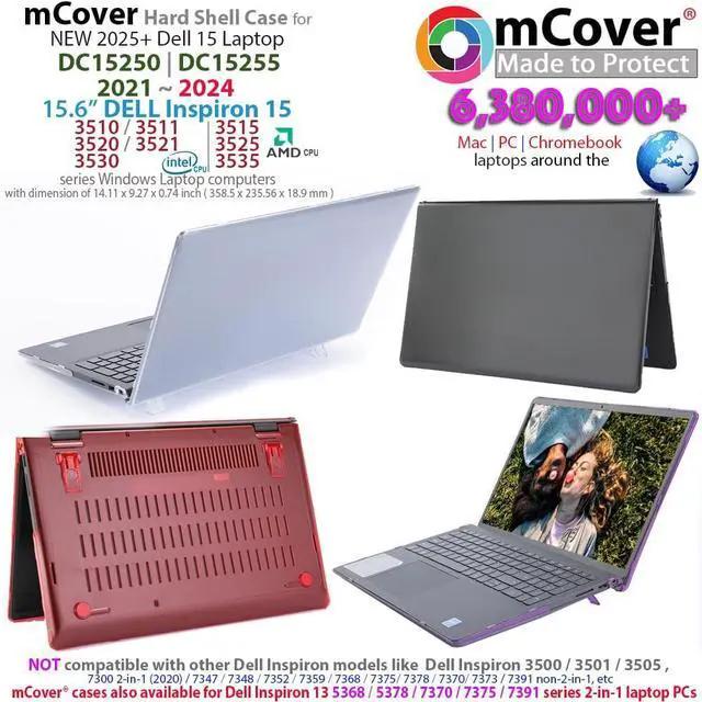 NOTE: Before placing order, PLEASE make sure to verify your laptop model number as this case is MODEL specific and NOT interchangeable. ^^ NOT fitting other Dell Insprion 15 laptops. NOT compatible with ANY other Dell laptops as well. ^^ Made of high-quality translucent polycarbonate material which is shatter-proof and will protect your 2021-2023 15.6" Dell Inspiron 15 3510 / 3511 / 3515 / 3520 / 3521 / 3525 Series Laptop Computer all around ^^ Designed to perfectly fit the 2021-2023 15.6" Dell Inspiron 15 3510 / 3511 / 3515 / 3520 / 3521 / 3525 series Laptop Computer with dimension of 14.11 x 9.27 x 0.74 inch ( 358.5 x 235.56 x 18.9 mm ) ^^ 2-piece light-weight ( 11.5 oz or 326 g ) shell easily snaps on and off.