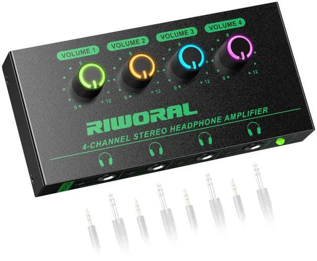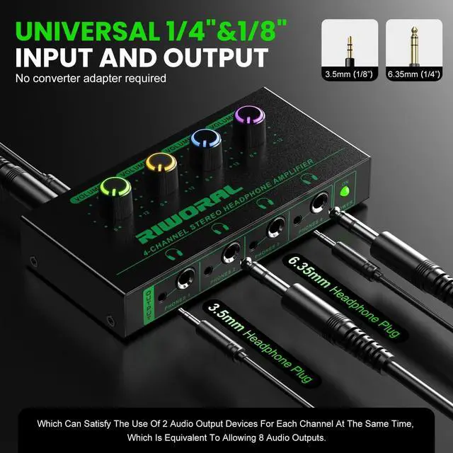 Riworal 4 Channels Headphone Amplifier with 3.5mm/6.35mm/ TRS Jack Input for Dj Mixer Amps Splitter with 8 Output Ports Separate Volume Control Output for Speaker Or Monitor Headphone