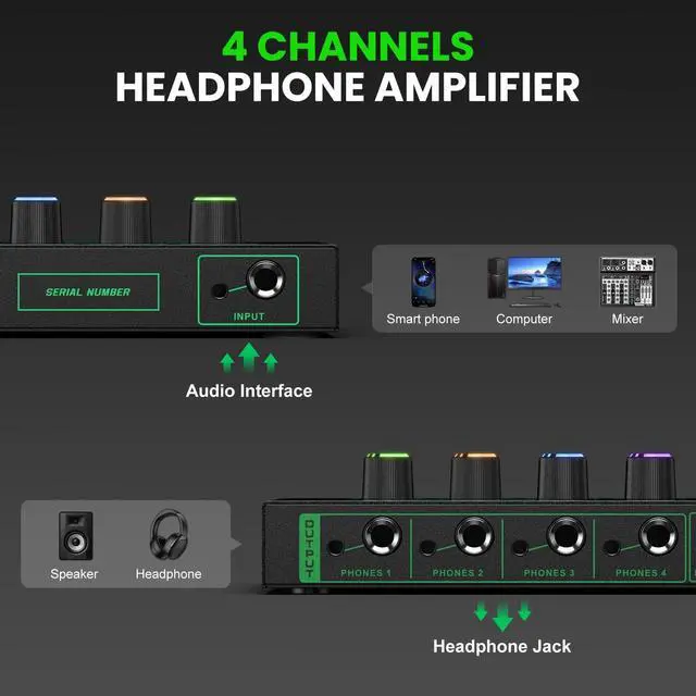 ^^ Audio Output Connection Devices Include Earphones And Speakers, Which Can Satisfy The Use Of 2 Audio Output Devices For Each Channel At The Same Time, Which Is Equivalent To Allowing 8 Audio Outputs. ^^ Mini Headphone Amplifier Is As Light As 14oz, Easy To Carry And Store, No Need To Carry Additional 6.35 mm Or 3.5 mm Adapters, You Can Directly Use 6.35 mm Or 3.5 mm Audio Cables For Direct Connection ^^ What'S Included In The Box1*Headphone Amplifier+1* 5v Power Plug+1*Usb To Type-C Charge Cable+1*Manual