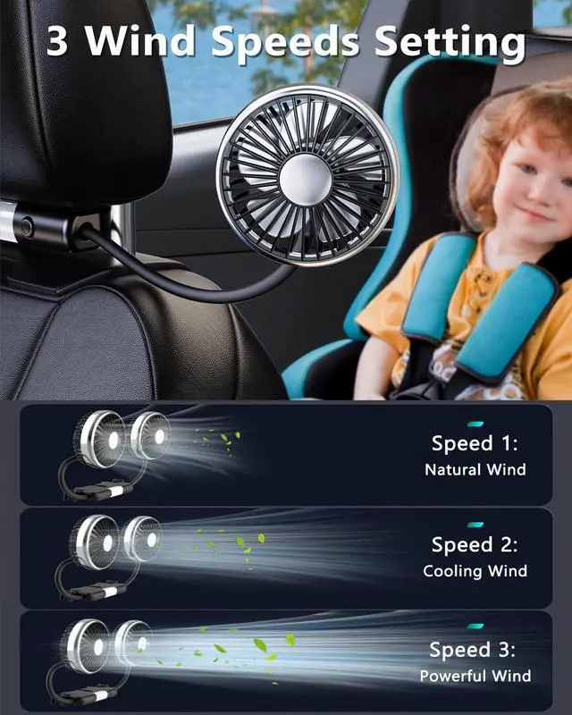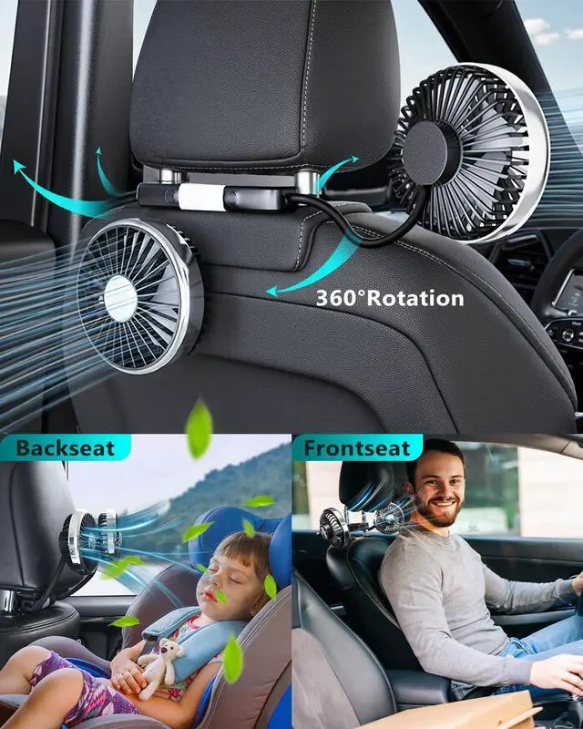 USB Car Fan: Our double usb fan for car back seat fits most vehicles with headrest rods, like SUV, Sedan, Van, and Pickup trucks. Equipped with a 70in (6ft) long USB-A to Type-C power cord, which can be powered by a car charger or power bank. A few seconds easy to install: Clip the ends to the headrest bar and done ^^