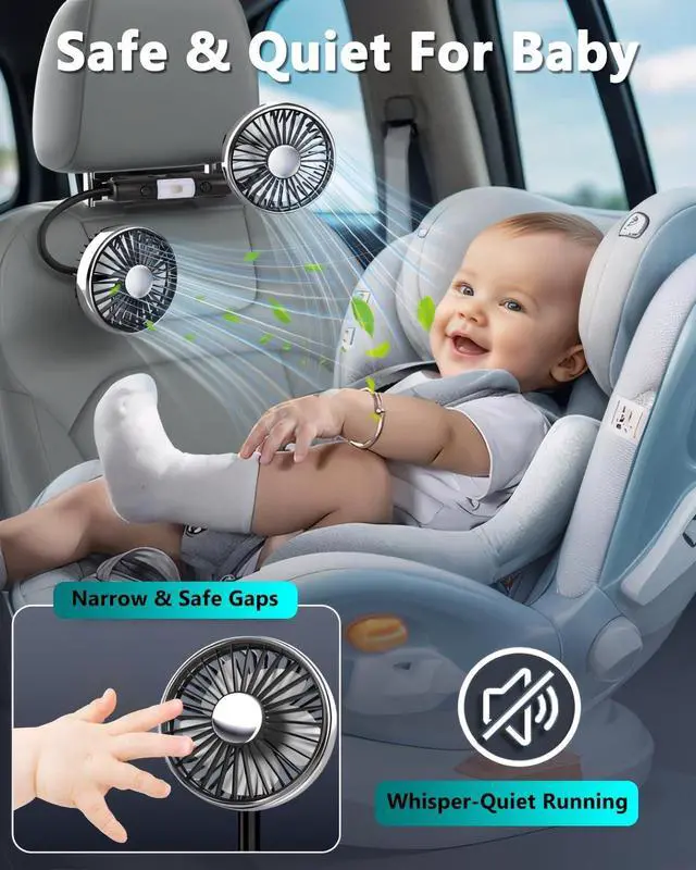 Fan for Car: Our hose dual head fan for car has 3 wind speed settings. The strong wind can quickly cool down the rear space, so you, your passengers, kids, baby, and pets can enjoy a cool summer ^^ Safe & Quiet Car Seat Fan: The cover of xuenair car seat fan for baby rear facing has narrow gaps so your kids and baby will have a safe play. Whisper-noise running has no disturbing your driving and baby rest. The baby is safer and more comfortable during car travel, the parents can drive more peaceful ^^ Fan for