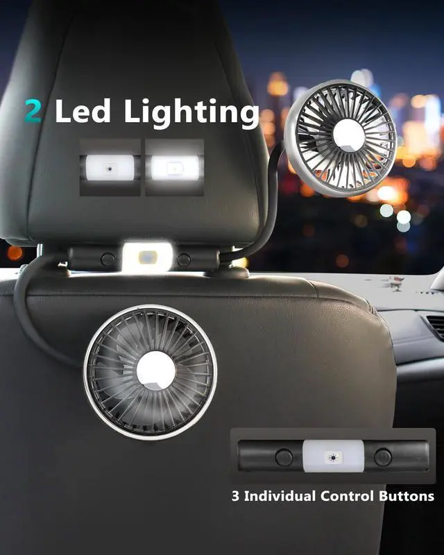 Car With LED Light: xuenair portable backseat car fan has 2 levels of LED light to used as a night light for sleep and backup light for looking items. The fan and light have independent control buttons and do not interfere with each other ^^ Easy Install