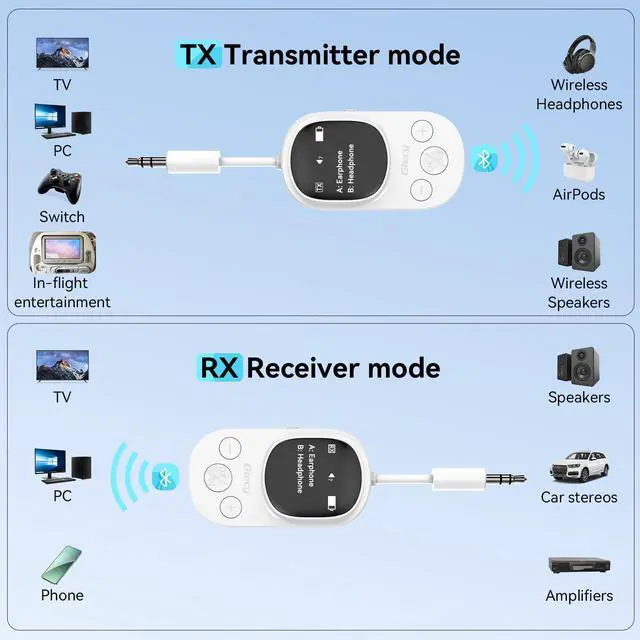 Easy Operation: The built-in LED display makes selecting and connecting devices effortless. With clear, real-time feedback, you can easily monitor the status of your connections and switch between devices with just a glance. Whether youre on a flight, at the gym, or watching TV, the LED screen ensures a smooth, user-friendly experience, making it simple to manage your wireless audio. ^^ TX & RX Modes for