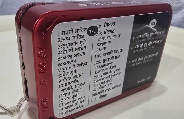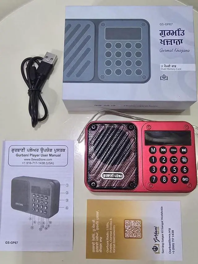 Gurbani players with 2 memory cards, first memory card contains all the Gurbani (Nitname, Sukhmani Sahib, Kirtan, Simran, Katha Dhadi Vaaraan) contents and second memory card contains the Sampooran Sehaj Paath. This player allows easy switch between the two memory contents remembering the last play position. Contents include 1 Gurbani Player 1 USB-C charging cable 1 Operational manual