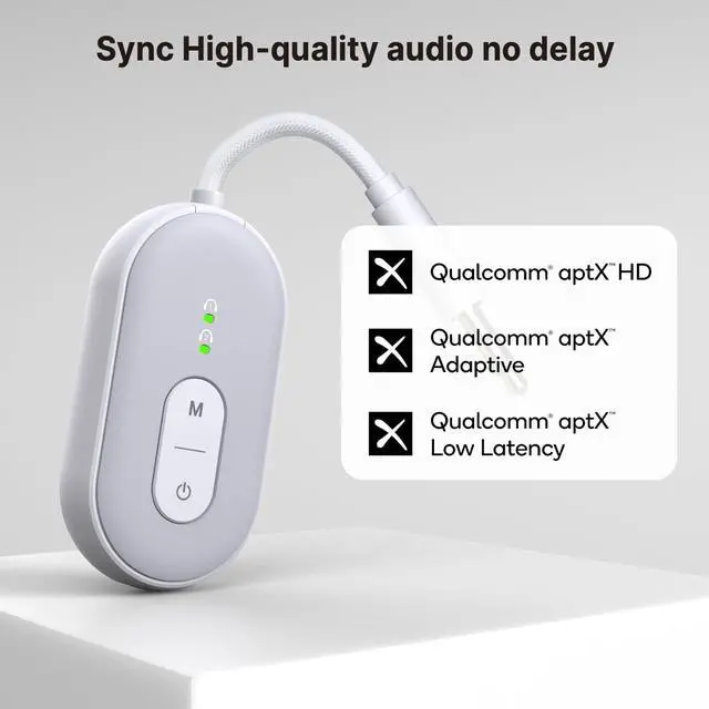 QUALCOMM HIGH PERFORMANCE CHIP: The Bluetooth audio adapter is built with the most advanced qualcomm chip, support for a wide range of Bluetooth audio coding protocols, including SBC, AAC, aptX, aptX-LL, aptX-HD. Ensuring high-fidelity stereo sound quality ^^
