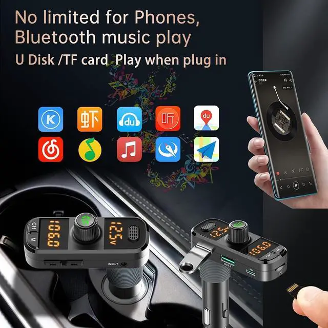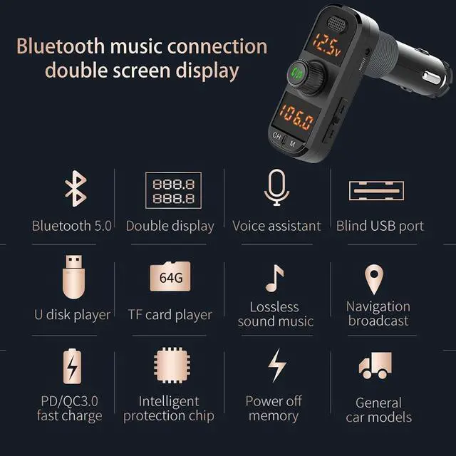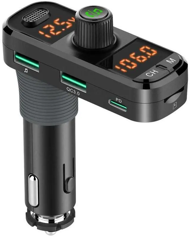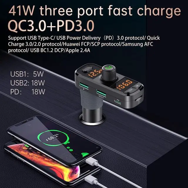 Bluetooth Note: Recommend to use aux cable to connect with car. In this way, static noise caused by local big radio station can be avoid. If you need to connect by radio, please choose a empty radio frequency that is far different from local station. Also please turn up the volume of cellphone and turn down the volume of car's. 41W! Charge Faster! 1Quick Charge 3.0 Port (18W) 1Power Delivery 3.0 Type-C Port (18W) 1USB port (5W) Support charging 3 devices simultaneously. Broad compatibility with Bluetooth enabled devices, such as iPhone, iPad, Samsung, Tablet and other Android Smartphones. Pair with