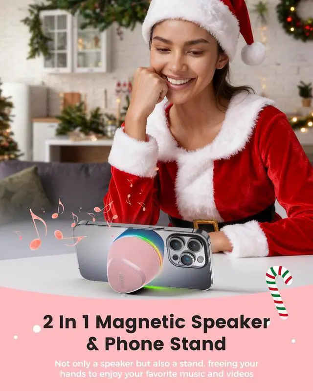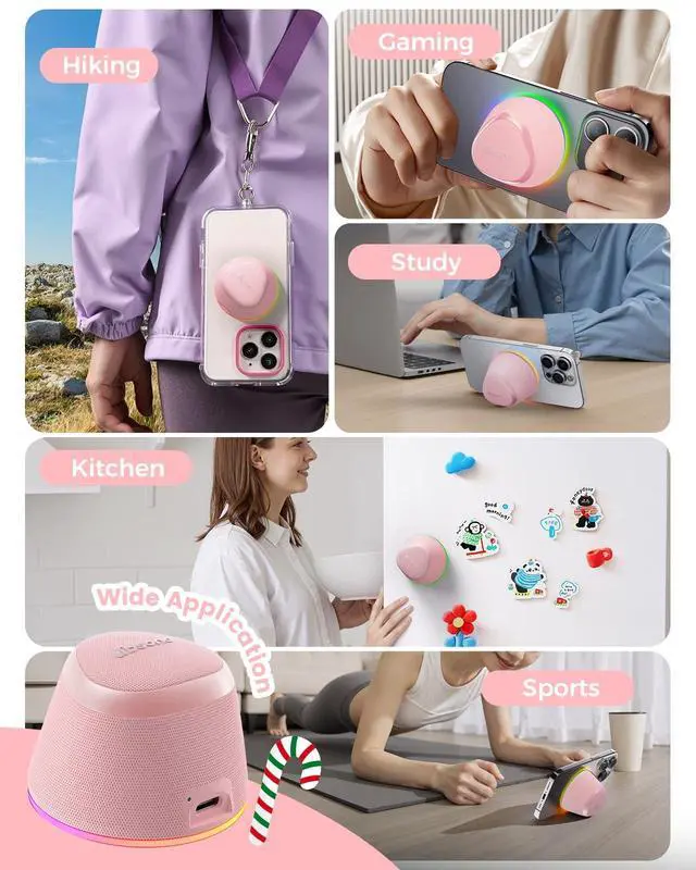 • [2-in-1 Speaker & Phone Stand] The small speaker is not only a Bluetooth speaker but also a durable mobile phone stand. The phone stand allows you to free your hands to enjoy music, so that you can do your own thing. These tiny speakers are useful and practical gadgets for everyone. NOTE: Compatible with iPhone 12/13/14/15/16 Series and Magsafe Covers do not need a Metal Ring. Other mobile phones & phone cases have to use a Metal Ring(included)