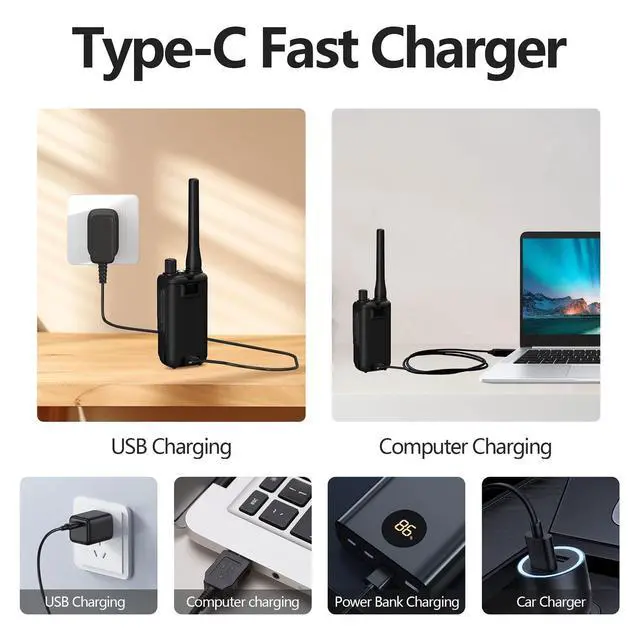 • The UV-5R MINI radio uses a Type-C charging port, allowing you to charge it in your car like a phone, or easily with a power bank or laptop. Its portability makes it easy to use on your travels