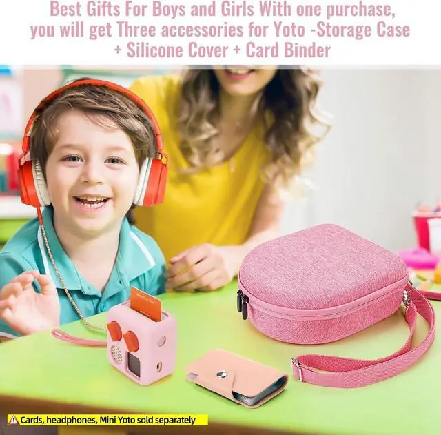 Hard Case Compatible with Yoto Mini (2024 Edition), 3-in-1 Travel Bundle: Silicone Cover + Case with Shoulder Strap (Fits Mini Player & Headphones) + Up to 10 Card Holder for YOTO Cards (Pink)