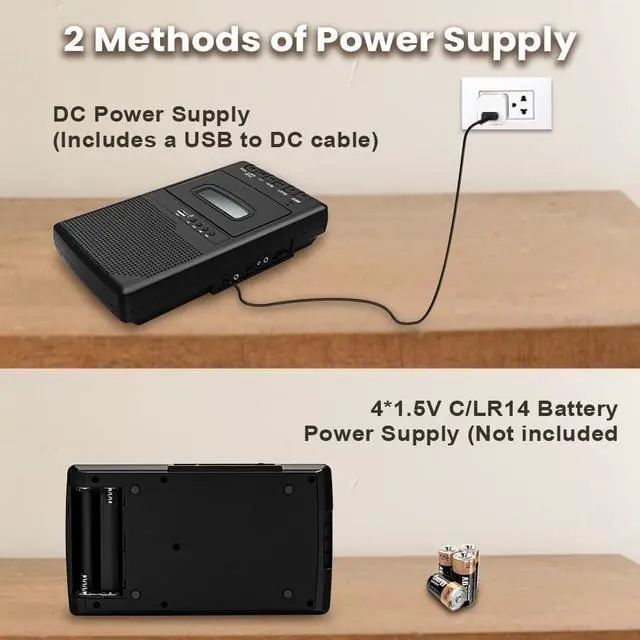 USB (USB flash drive format: FAT32 format, up to 32G supported) without the need for additional drivers or complicated settings. It is ideal for digitizing old mixtapes, home recordings or rare music collections before they deteriorate, preserving audio quality and minimizing loss. ^^ Professional Recording FunctionQuickly record meetings or inspiration clips with the built-in microphone, or use the included clip-on lavalier microphone to accurately pick up sound and effectively reduce ambient noise. Record clear audio to tape or USB flash drive for interviews, podcasts or lectures. ^^ High Quality Sound QualityThe tape cassette player has a built-in 3W clear speaker and adopts a low-noise tape drive system to reduce background noise and provide purer playback sound quality. You can connect 3.5MM headphones to enjoy personal time. ^^ Portable and User-Friendly DesignThe lightweight body features a sturdy carrying handle for easy portability, with optional battery power (4* 1.5V C/LR14, not included) or DC 5V power adapter (not included) operation. Clearly labeled function buttons ensure intuitive and convenient operation.