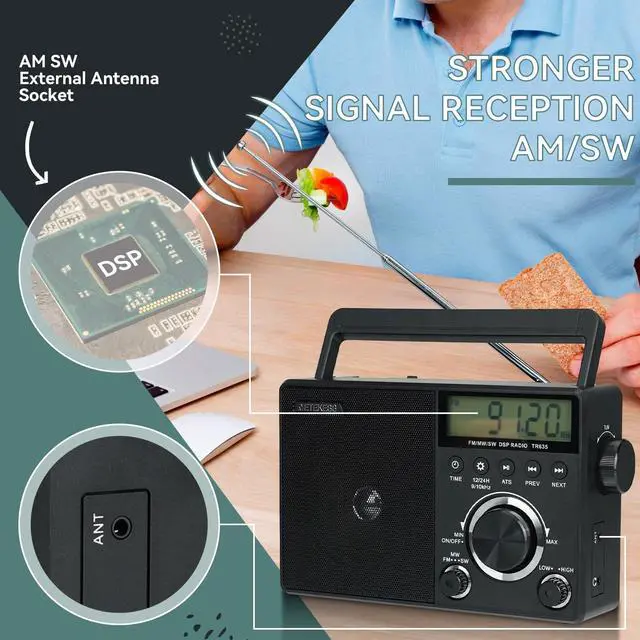 AM FM SW band radio; 3 frequency band radio, better receiving effect; good receiving performance; listening to your favorite radio programs anytime; anywhere ^^ Clear sound speaker; with 3.5 inch large speakers for loud and clear sound and excellent sound quality; volume is high enough for indoor or outdoor; you can use portable radio to listen to news, music and games ^^ Easy to operate; large setting of the dial and large button hand; simple and clear function display; no complex function buttons; very suitable for the elderly and also a suitable gift for young people to give it to elders ^^ Simple and clear layout; easy to observe; well made sturdy case is durable; not easy to scrape and wear; suitable for outdoor scenes such as beaches ^^ Retro radio design; enhances the fashion aesthetic; can be used as home decoration to enhance the retro atmosphere of the living room