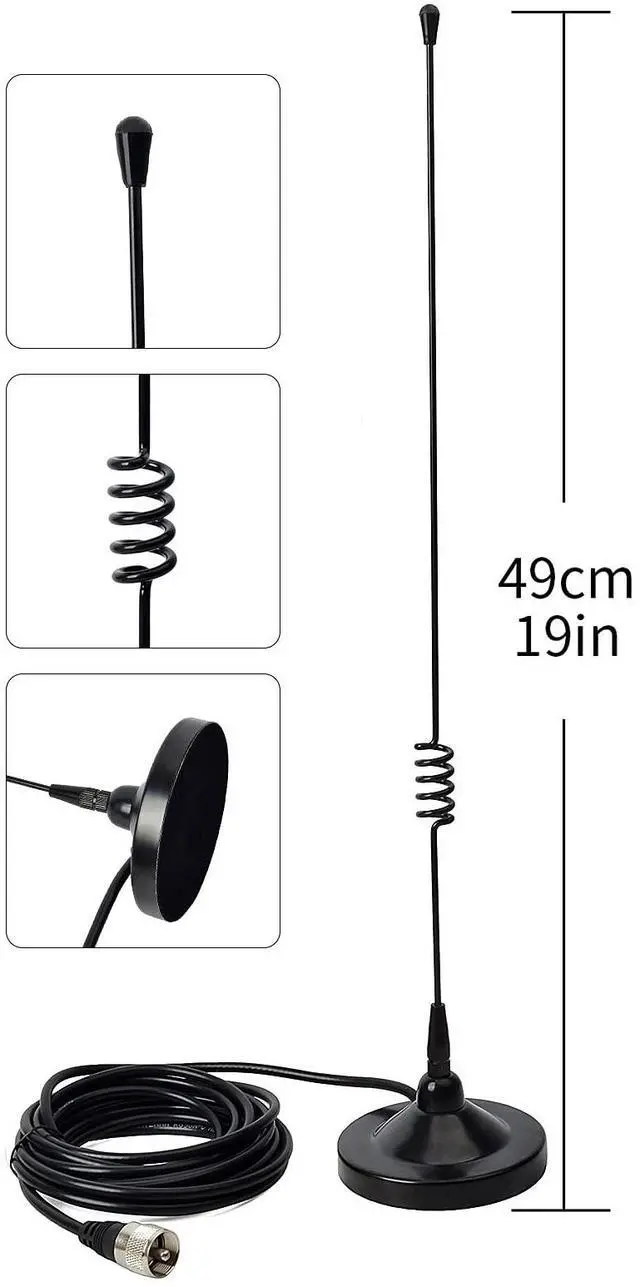 MR77V magnetic mount mobile antenna is a high gain dual band mobile antenna. It can effectively increase the receiving and firing range of your equipment. ^^ With a diameter of 3.5 inches magnetic mount, you to easily install it to your vehicle. The cable is 16.4 ft RG58 Cable with PL259(UHF-Male) Connector in the end of the cable.