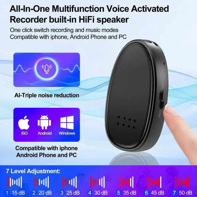 Hi-Fi Sound: This portable recorder device allow you to customize the recording quality up to 3072kbps, let you can choose the most suitable recording bit rate based on your usage needs, bringing you clearer sound, this recorder can ensure that you don't miss any important knowledge points or meeting content, making your study and work more efficient, this voice recorder is your best little assistant. ^^ Smart Noise ReductionThis digital voice recorder adopted HD Triple Noise Reductio Technology, the intelligent sound processing chip of this recorder can automatically reduce to record ambient noise by 90%, provided you a more realistic and clear voice, Meanwhile, this audio recorder also come with a HiFi lossless sound quality external speaker, allow you playback recording or music directly.