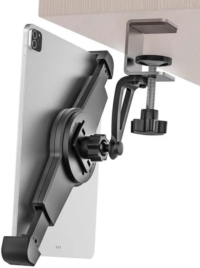 Hands Free Kitchen Tablet MountThis is a very practical clip on tablet stand for cabinets, especially for beginners in cooking. This stand frees up your hands and allows you to easily watch instructional videos while learning and operating, making the entire process smoother. ^^ Broad Application Clamp BaseYou can easily fix the bracket to the cabinet without the need for additional tools for learning cooking. In addition, the durable aluminum alloy fixture is suitable for countertops with a maximum thickness of 2.36 inches, so the bracket can also be fixed to tables, bedside tables, etc.