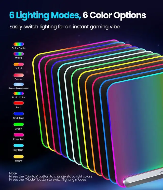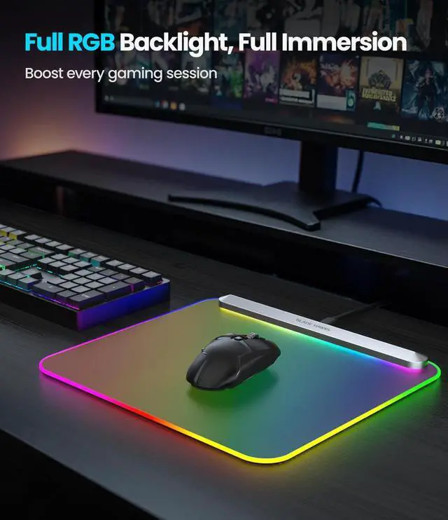 Mouse Pad: Experience vivid RGB lighting with a full backlight design that evenly illuminates the entire surface. The gaming mouse pad offers a dynamic, immersive lighting experience that enhances gameplay ambiance. Paired with a detachable 59'' USB Type-C cable, this mouse pad ensures an effortless setup for an enhanced visual experience. ^^ 6 Dynamic Lighting