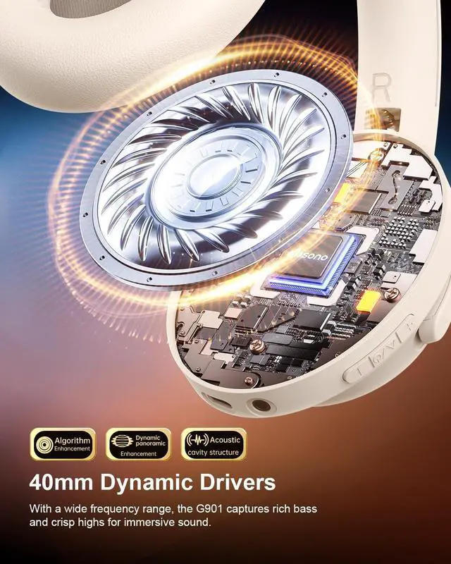 Deep Bass: Equipped with custom 40mm dynamic drivers, G901 over-ear headphones deliver High-quality audio with balanced deep bass and crisp highs. Whether wireless or wired (via 3.5 mm AUX), enjoy studio-quality sound with enhanced clarity and detail, perfect for music, movies, and gaming ^^ Ultra-Long 60-Hour Music Playtime & 40H