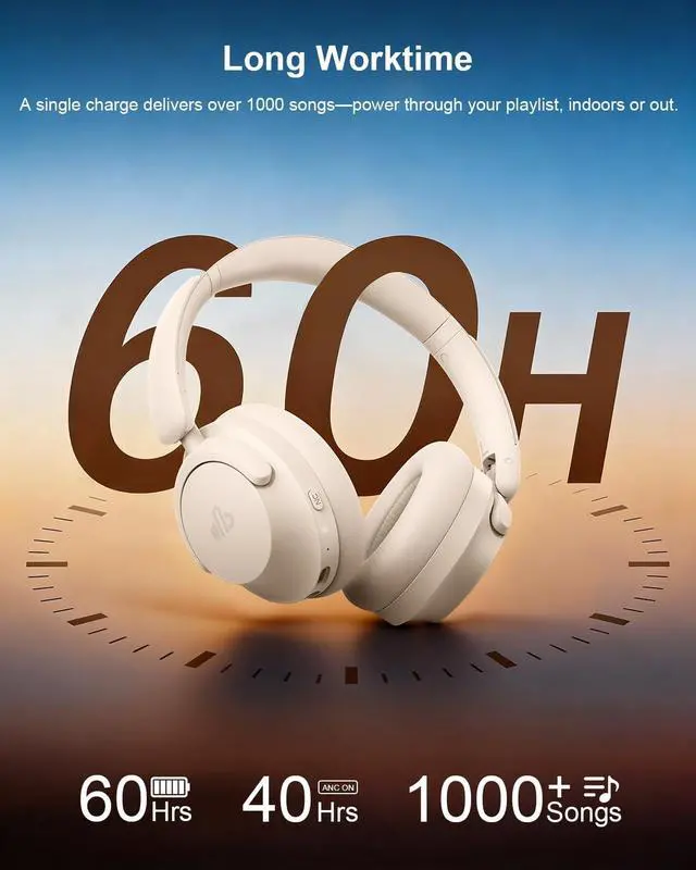 ANC Playtime: Enjoy up to 60 hours of non-stop playback in ANC-off mode (40 hours with ANC on). One single charge gives you enough juice to listen to over 1000 songs or soundtrack multiple long haul flights. Good ideal for long flights or daily commutes. The included AUX cable ensures uninterrupted listening even when the battery runs low ^^ All-Day