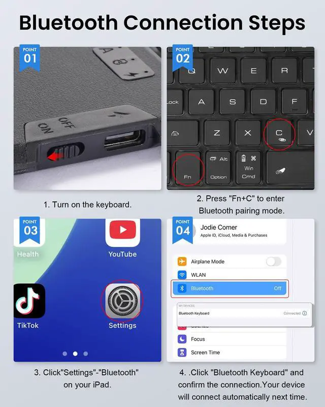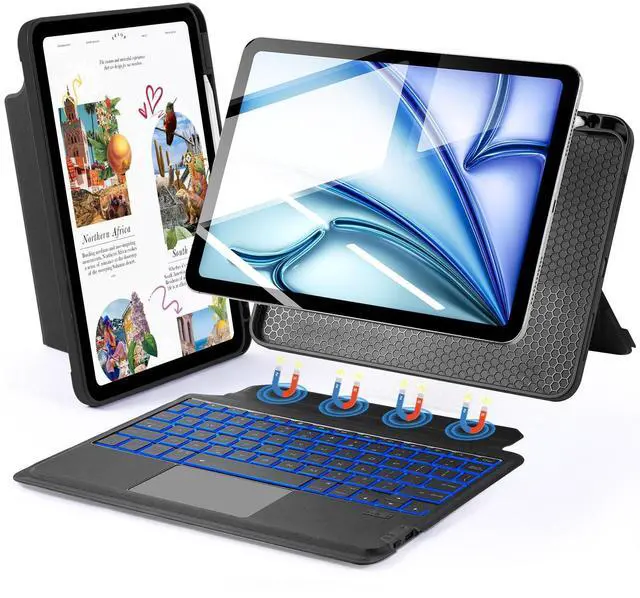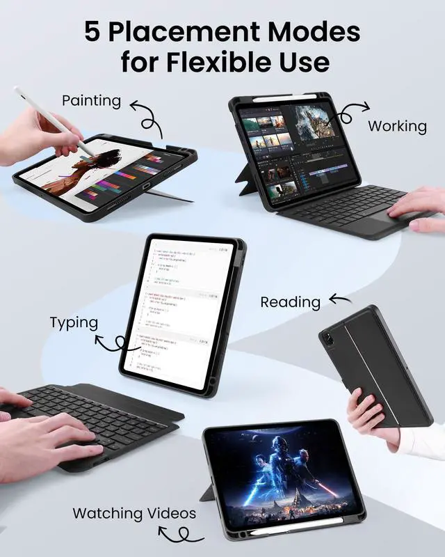 Design: Detachable Magnetic Keyboard Case Stand, strong magnets secure stable attachment. Instantly transforms iPad case into a typing keyboard or adjustable viewing stand. Suitable for movies, video calls and meetings. Ideal for office, travel, and outdoor adventures. PU Leather full-edge coverage, protects tablet from drops and scratches. ^^ Precision Touchpad & Advanced OS Integration: Precision Touchpad with 18+ intuitive gestures (swipe, pinch, scroll) and palm rejection for seamless navigation; built-in shortcuts for screenshot, desktop return, and app-switching to maximize productivity. Lightning-fast cursor control and multimedia optimizations elevate workflows for documents, web browsing, and presentations. ^^ Silent Backlit Keys & Long