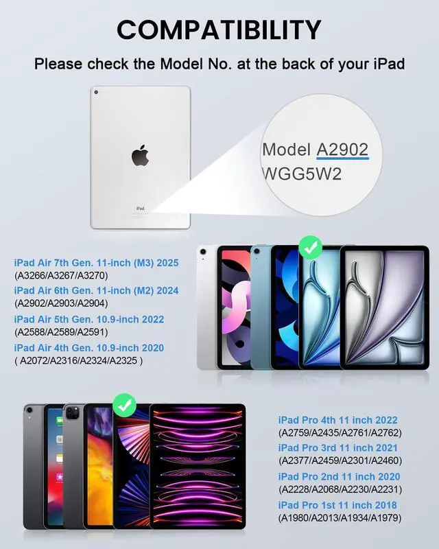 Compatibility: The keyboard case is compatible with iPad Air (M3) 11-inch 2025 (A3266/A3267/A3270), iPad Air 6th 11-inch (M2) 2024(A2902/A2903/A2904), iPad Air 5th 2022(A2588/A2589/A2591), iPad Air 4th 2020A2072/A2316/A2324/A2325), iPad Pro 11-inch 2022 (A2759/A2435/A2761/A2762), iPad Pro 11" 2021(A2377/A2459/A2301/A2460), iPad Pro 11" 2020 (A2228/A2068/A2230/A2231), iPad Pro 11" 2018 (A1980/A2013/A1934/A1979).