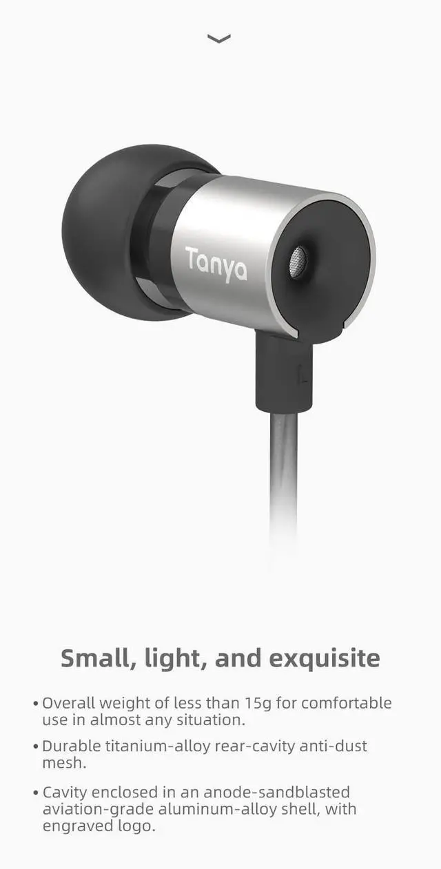 Small, light, and exquisite Overall weight of less than 15g for comfortable use in almost any situation. Durable titanium-alloy rear-cavity anti-dust mesh. Cavity enclosed in an anode- sandblasted aviation-grade aluminum- alloy shell, with engraved logo.