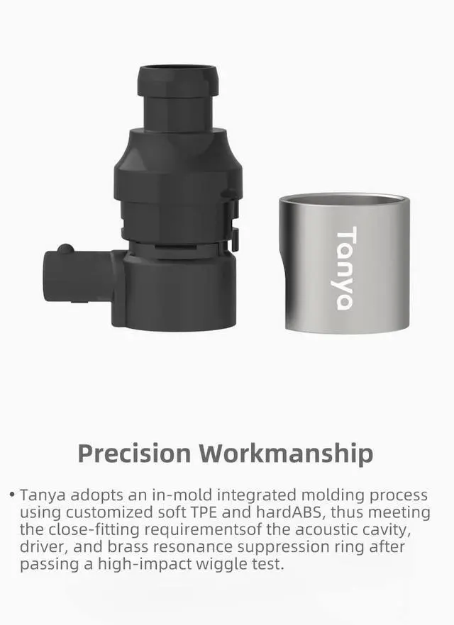Precision Workmanship Tanya adopts an in-mold integrated molding process using customized soft TPE and hardABS, thus meeting the close-fitting requirementsof the acoustic cavity, driver, and brass resonance suppression ring after passing a high-impact wiggle test.