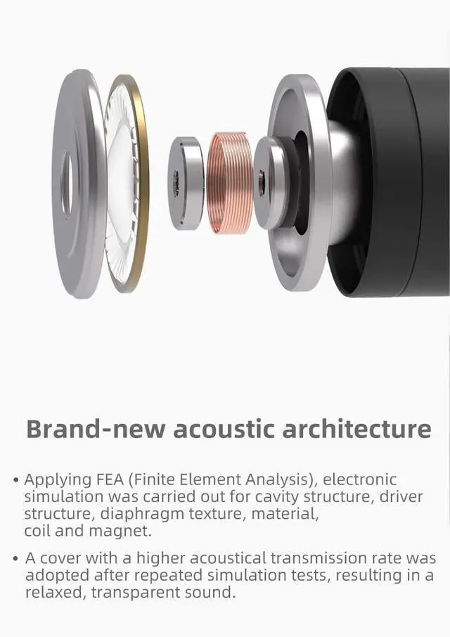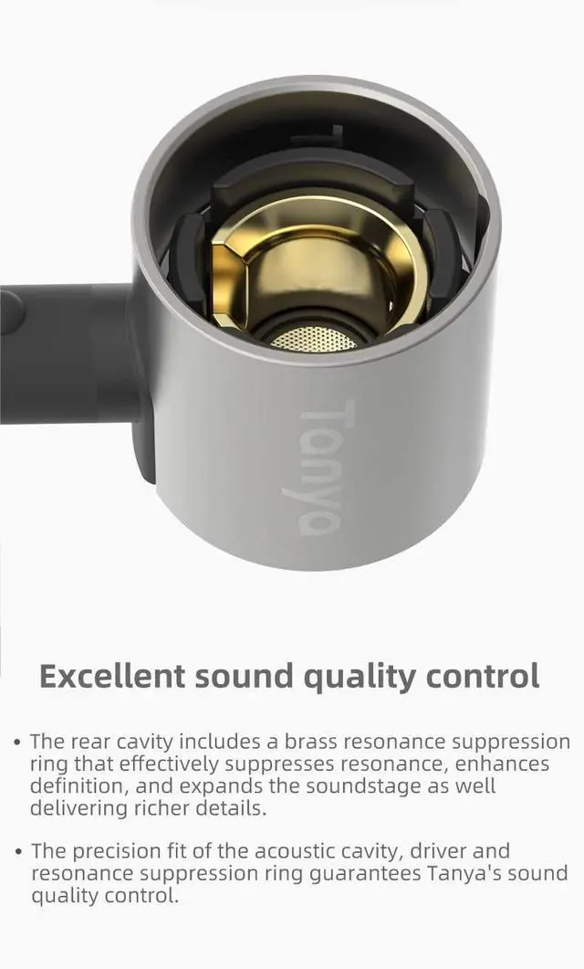 Excellent sound quality control The rear cavity includes a brass resonance suppression ring that effectively suppresses resonance, enhances definition, and expands the soundstage as well delivering richer details. The precision fit of the acoustic cavity, driver and resonance suppression ring guarantees Tanya's sound quality control.