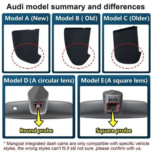 PlEASE CHECK YOUR MODEL CAREFULLY THE WRONG MODEL CANNOT BE INSTALLED SUCCESSFULLY. Several buyers were unable to install it properly because they bought the wrong model. Seriously compare THE SECOND PICTURE and THE FIRST PICTURE of Product Description. If you are still not sure which model is suitable for your vehicle style, please contact us at any time. Please take a photo of your original car sensor cover. and send it to us, and we will confirm it for you. ^^ Custom fit for AudiMangoal 4k dash cam can fit perfectly behind the rear view mirror like original.