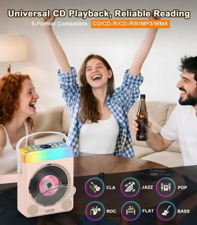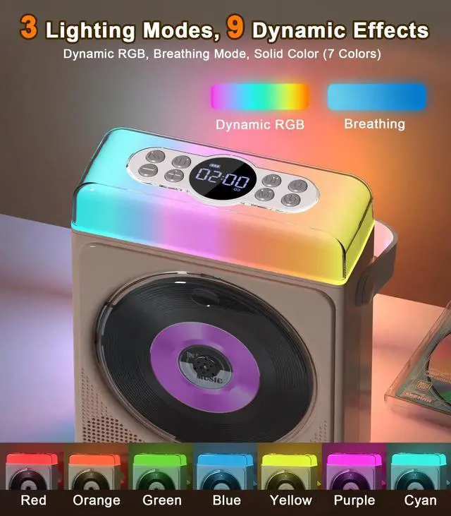Modern Nostalgia All Your Music, Any Way You WantBring back classic CDs and mix them with modern tech! This portable CD player with Bluetooth supports CD, CD-R/RW, MP3, and WMA. Stream wirelessly or play directly via USB, TF card, or AUX. A must-have cd player with speakers for home or travel. ^^ Mood Lights That Dance with Your MusicLight up your vibe with this portable CD player with speakers and RGB lights!