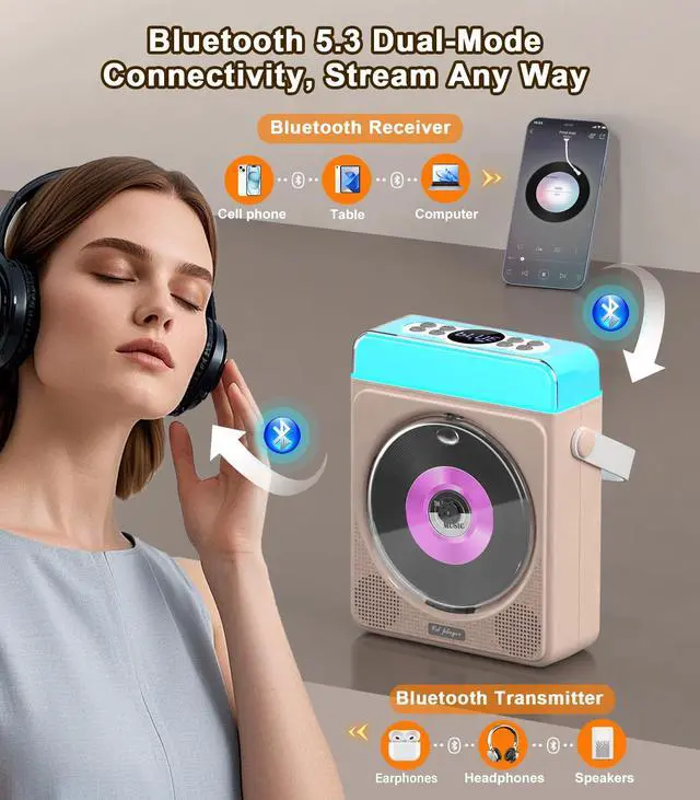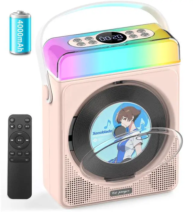 Choose from 3 modes: Dynamic Multi-Color (rainbow cycling), Breathing Light (soft fade in/out), or Solid Color (tap to switch hues). Perfect for kids, bedrooms, or partiesyour music, your glow. ^^ Bluetooth Transmit & Receive Play Your WayEnjoy total flexibility with this portable CD player with Bluetooth. In Transmit Mode, connect wireless headphones for private listening. In Receive Mode, turn this CD player with speakers into a Bluetooth speaker for your phone or laptop. Perfect portable cd players for home. 10m range + remote control = hands-free convenience. ^^ Long-Lasting Power for Every OccasionThis portable Bluetooth CD player packs a 4000mAh rechargeable battery for up to 11 hours of playtime. Perfect for backyard BBQs, camping trips, or chill nights at home. The rechargeable cd player portable charges via USB-C (cable included). ^^ Smart Features, Easy ControlCustomize sound with EQ, set a 1090 min sleep timer, or loop songs for study or sleep. Our personal cd players are simple, fun, and durableperfect for kids, learning, or relaxation. A great Bluetooth CD player for home or travel that makes music easy anytime.