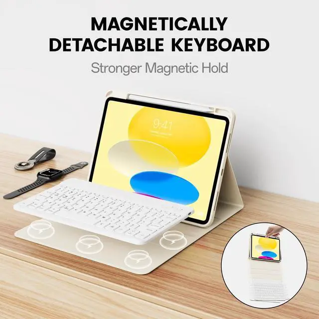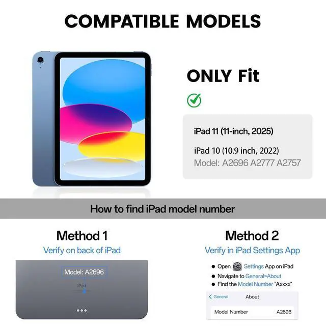 Perfectly fits models: A3354, A3355, A3356, A2696, A2757, A2777. Not compatible with any other iPad models. Please verify the model number on the back of your iPad to ensure a perfect fit. ^^ Slim Magnetic Bluetooth KeyboardExperience the ultimate versatility with our detachable, ultra-slim ( 6.2 mm) keyboard that attaches wirelessly via powerful magnets. Instantly convert your iPad into a portable laptop for work, study, or entertainment. Effortlessly compatible with iOS, Android, and Windows, The ipad a16 case with keyboard is your all-in-one productivity powerhouse. ^^ Long-Lasting Battery & Multiple Viewing AnglesThe rechargeable keyboard boasts a long-lasting Li-polymer battery. Enjoy up to 3+ days of standby time on a single, quick charge. The durable folio case allows you to set your iPad at multiple secure angles for the most comfortable typing, browsing, and video-watching experience. ^^ Built-in Pencil Holder & Durable PU MaterialThe ipad 10th generation case with keyboard features a convenient built-in pencil slot on the right side for easy storage and access (Apple Pencil not included). The premium PU leather cover is waterproof, scratch-resistant, and fingerprint-resistant, providing full protection for your iPad a16.