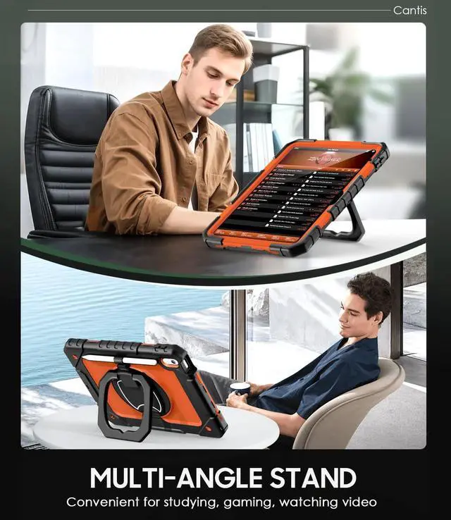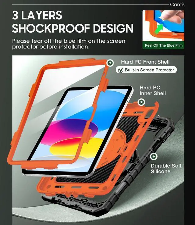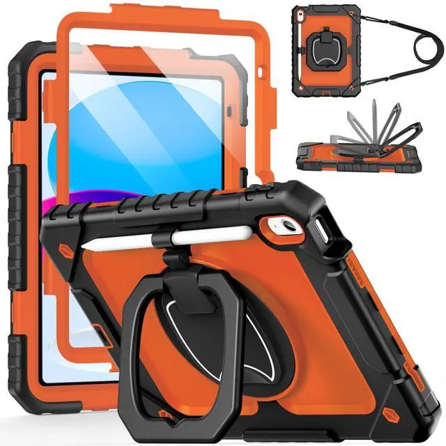 Cantis Case for iPad (A16) 11th/ 10th Generation 11/10.9 Inch 2025/2022, Shockproof Case for iPad 11 with Screen Protector/Rotating Stand/Adjustable Shoulder Strap/Pen Holder, Black+Orange