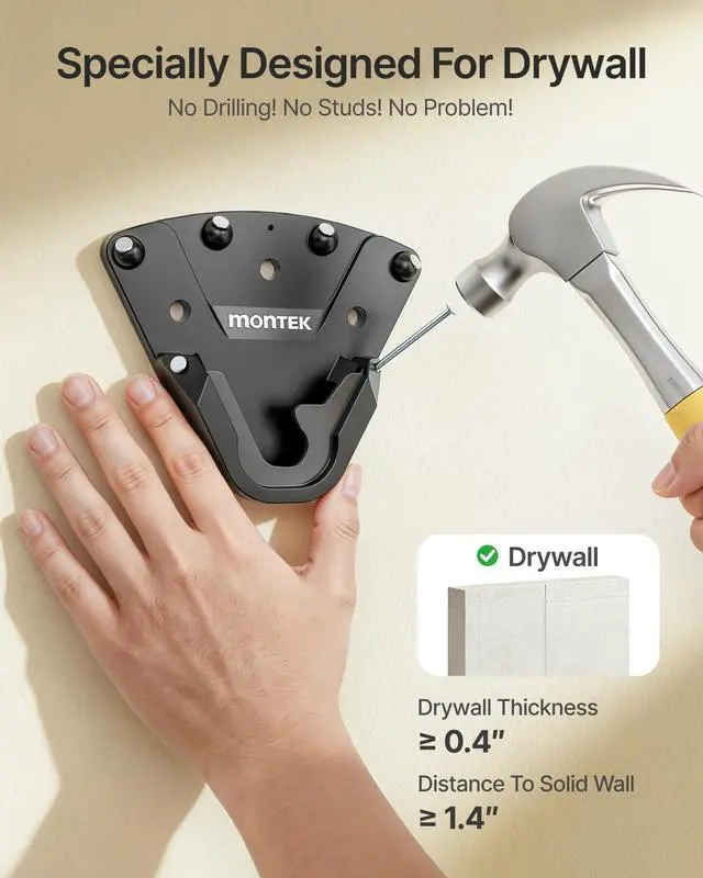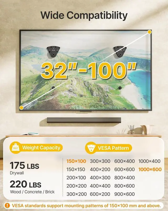 HEAVY DUTY & SAFETY FIRST This no stud TV wall mount supports TVs up to 175 lbs on drywall and 220 lbs on wood studs, concrete, or brick (4X load tested). Its heavy-duty design securely holds your 32-100 TV with a worry-free experience. So you can mount with confidenceeven for large screens ^^ EASY NO DRILL INSTALLATION No studs, anchors, or drilling required for drywall. Perfect for renters and DIYers, the monTEK studless TV wall mount provides a fast, damage-free setup for 32100 TVs. Its smart slide-in design lets you easily mount, remove, or reposition your TV anytime, making it ideal for apartments, bedrooms, and living rooms ^^ UNIVERSAL FIT FOR LARGE TVs Compatible with 32100 flat and curved TVs, supporting VESA patterns from 150100 mm to 1000600 mm.