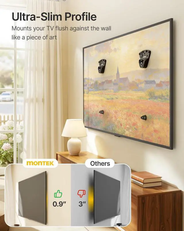 (NOTE: NOT compatible with 100150mm VESA mounting patterns) ^^ MULTIPLE WALL TYPES COMPATIBLE This tv mount works seamlessly on drywall, wood studs, concrete, and brick walls. All necessary hardware is included for every wall type, making setup quick, flexible, and hassle-free. Engineered for stable and reliable installation, it gives you the confidence to mount your TV anywhere in your home ^^ 0.9" SLIM-FIT DESIGN This ultra-slim mount sits just 0.9" from the wall, keeping your TV close for a sleek, low-profile look. As a no drill drywall TV mount with included rubber spacers, it preserves your walls, leaving minimal marks while maintaining a clean, modern appearance