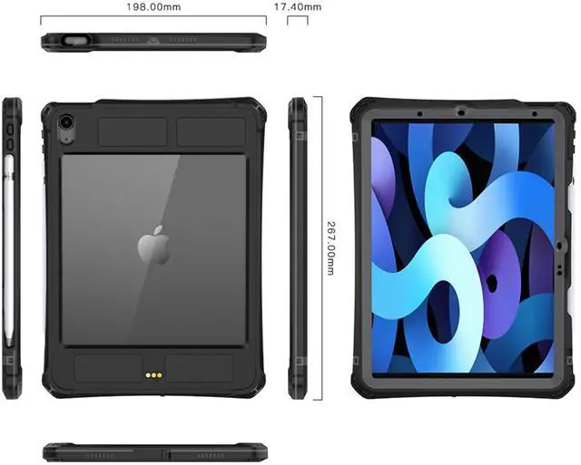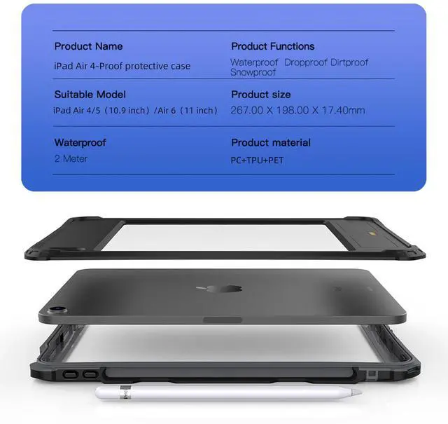 Support Model: IP 68 Waterproof Shockproof dust and snow proof for iPad Air 11 inch 2025 6th generation case 2024, and air 4 air 5, please check the tablet model before order. ^^ Real IP68 Waterproof - The case for iPad Air 11 inch 2025 2024 M2 case supply certified superior waterproof up to 20ft (6m) 30mins to safeguard your tablet against water, rain and snow while maintaining full touch screen functionality. ^^ Good use for indoors, also for swimming, fishing, sailing, kayaking or other water sports from drops and avoid scratches from all angles when your use our waterproof case cover for ipad air 11inch 2025 2024 M2 6th generation. (Please follow the instruction manual and video for installation test and use, make sure the tablet case is completely closed tight all the around). ^^ Foldable Kickstand - The cover case for iPad Air 11 2025 2024 M2 6th 5th 4th Generation with a foldable sturdy kickstand on the back. It support multi viewing angles, both vertical and horizontal, viewing for watching videos, attending conferences, typing, drawing, keeping your hands-free. ^^ This heavy duty ip68 waterproof case for iPad Air 11 Inch 2025 2024 M2 and air 5 air 4 generation, made by hard PC and inner soft TPU, screen protector is PET.